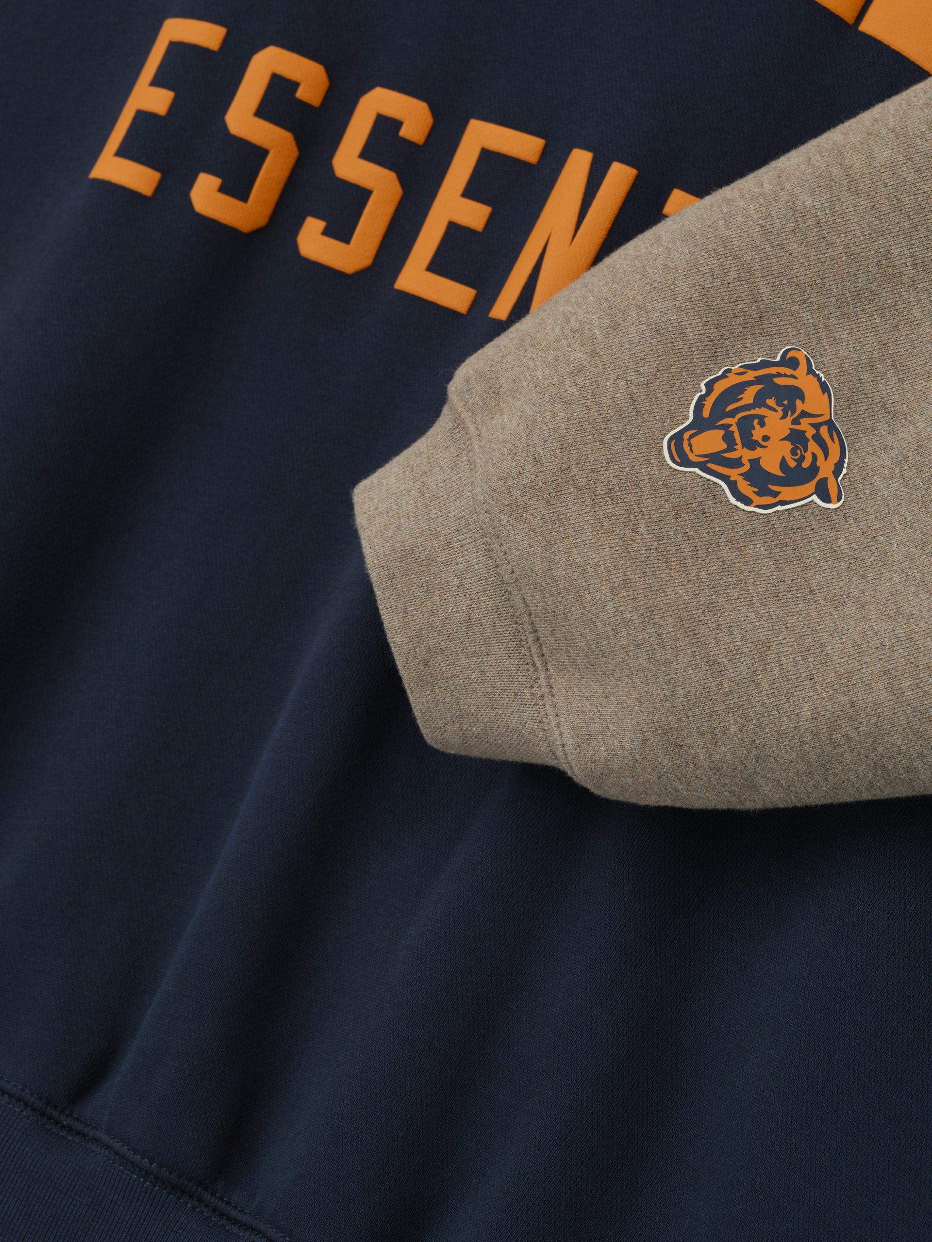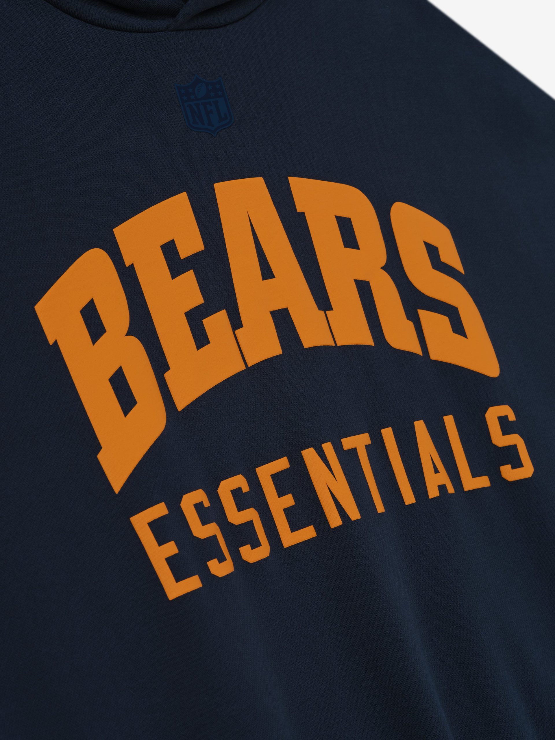 The Bears Sport Hoodie is crafted from heavy 480gsm core fleece and cut in a relaxed sport fit. The front features a bold Bears Essentials puff-print graphic paired with the official NFL shield logo. Additional features include. contrasting sleeves. side pockets. rib-knit at the cuffs and waist hem. The signature rubberized Fear of God Essentials label accents the hood.
