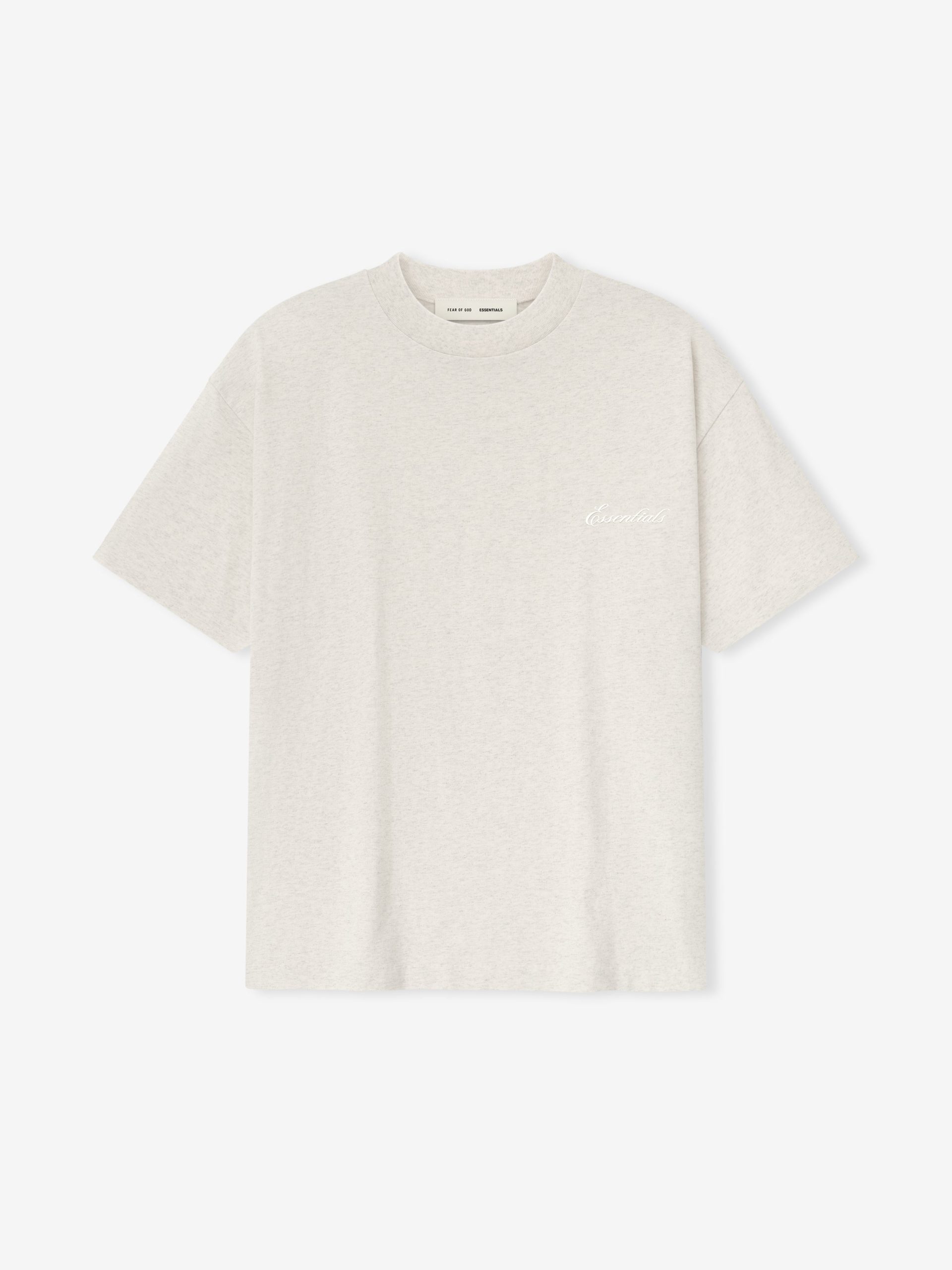 The Classic Tee is made from medium-weight 100% cotton jersey. The rib-knit crewneck tee features a classic fit with signature Fear of God relaxed proportions for everyday wear. Branding includes an embroidered Essentials script logo on front and the Fear of God Essentials label at the back collar.