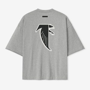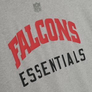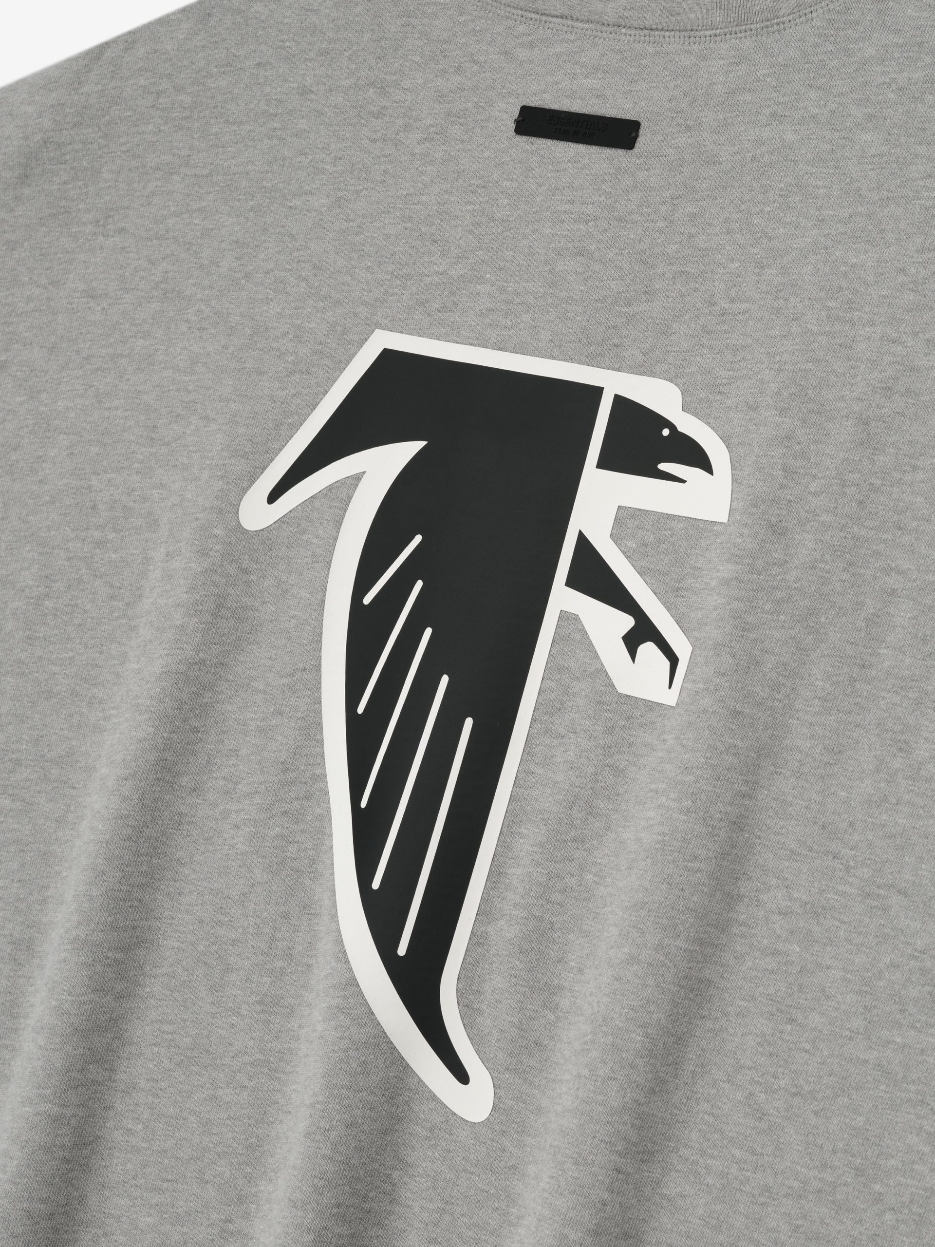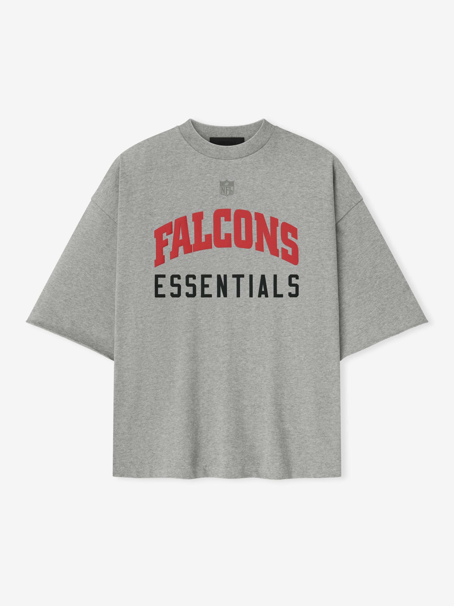 The Falcons Sport 3/4 Sleeve Football Tee is crafted from heavy 100% cotton jersey and designed in an extra-oversized fit with proportions inspired by 90s throwback football jerseys. The front features a bold Falcons Essentials puff-print graphic paired with the NFL shield. while the back displays the official Atlanta Falcons logo. Additional details include rib-knit collar. and 3/4 sleeves with raw hemline. The look is finished with the signature rubberized Fear of God Essentials label.
