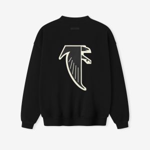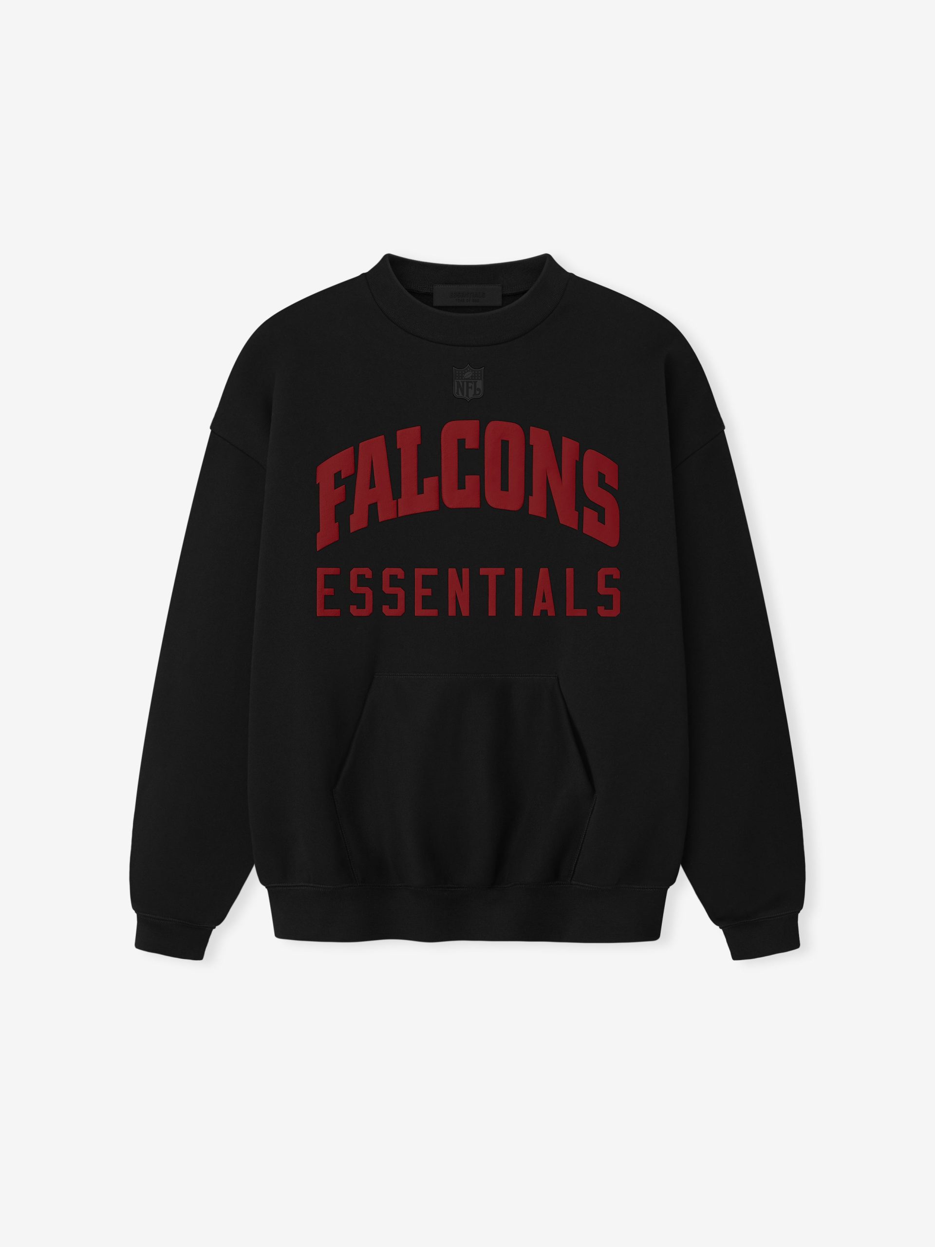 The Falcons Sport Crewneck is crafted from heavy 480gsm core fleece and cut in a relaxed sport fit. The front features a bold Falcons Essentials puff-print graphic. while the back displays the official Atlanta Falcons logo. Additional details include a kangaroo pocket and rib-knit collar. cuffs. and waist hem. The look is finished with the signature rubberized Fear of God Essentials label.