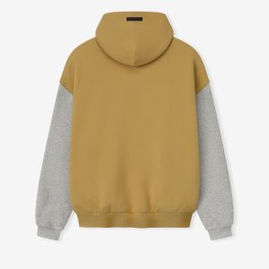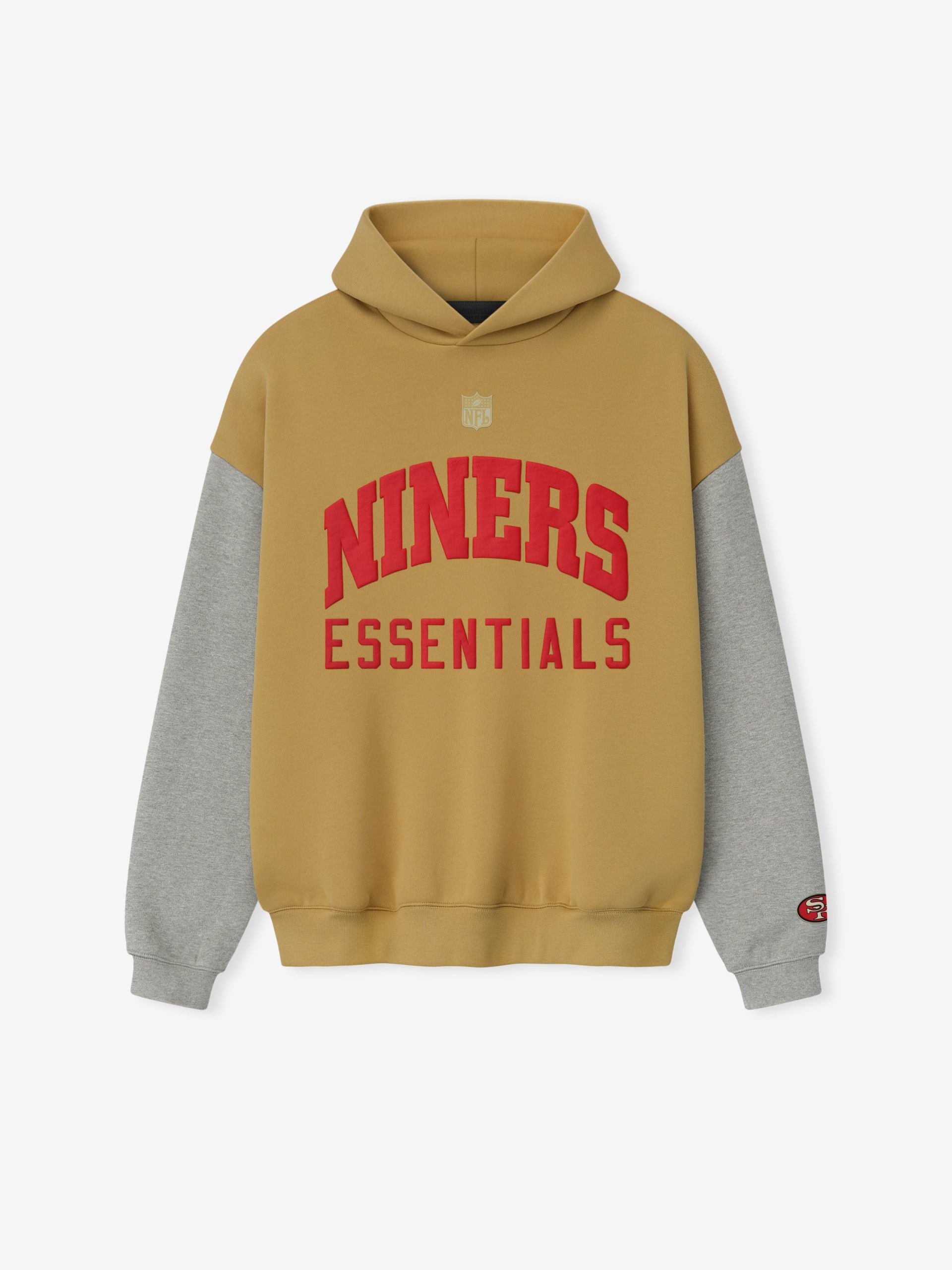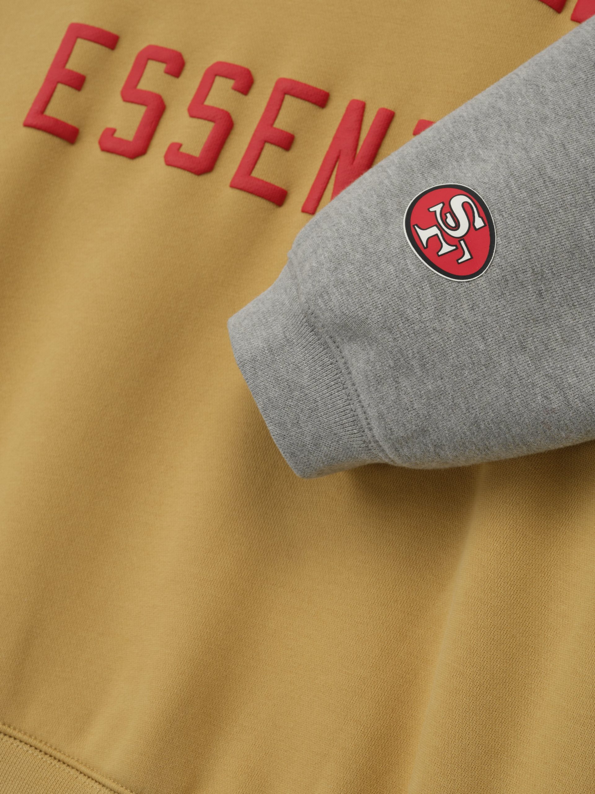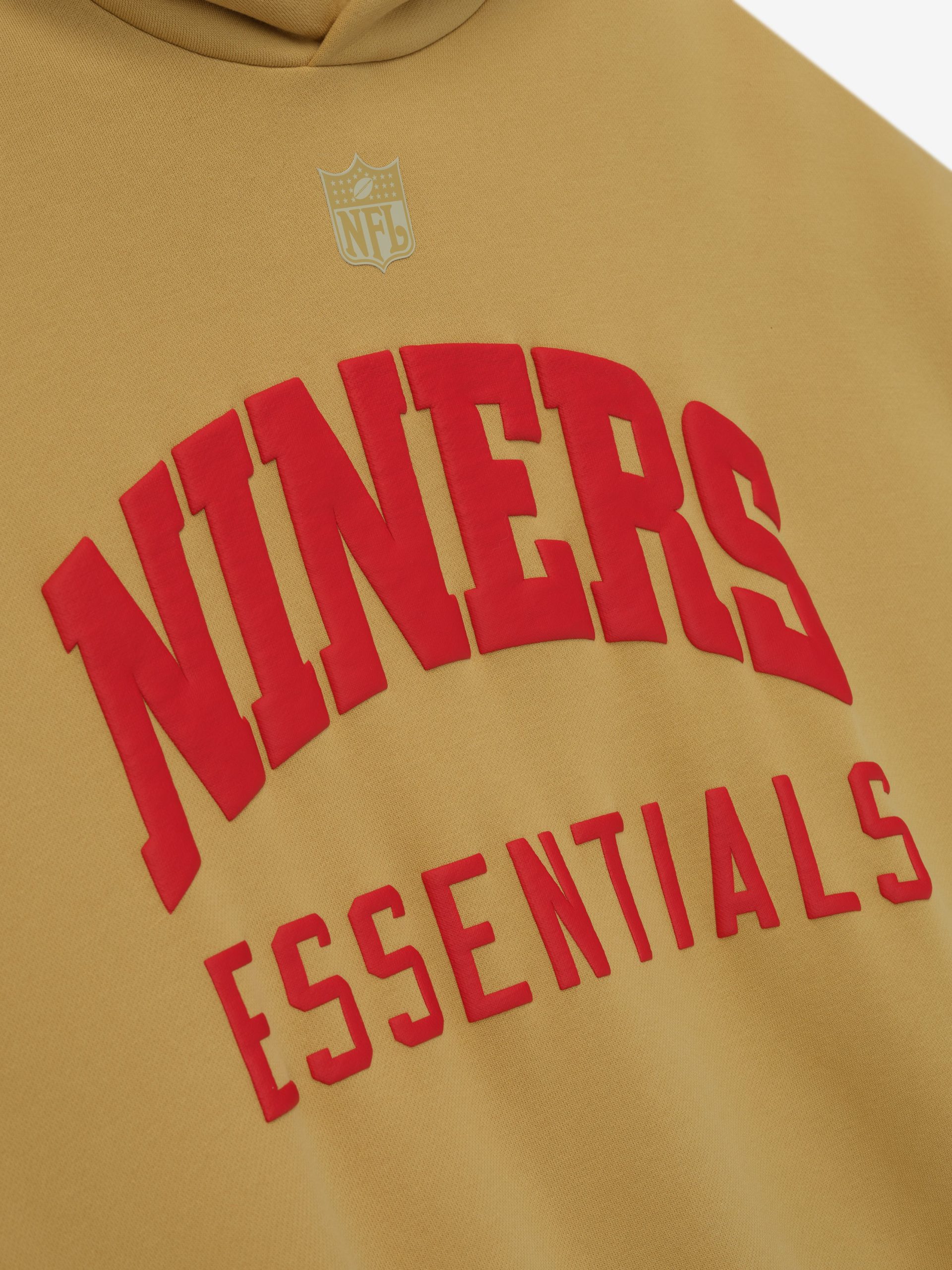 The Forty Niners Sport Hoodie is crafted from heavy 480gsm core fleece and cut in a relaxed sport fit. The front features a bold Niners Essentials puff-print graphic paired with the official NFL shield logo. Additional features include. contrasting sleeves. side pockets. rib-knit at the cuffs and waist hem. The signature rubberized Fear of God Essentials label accents the hood.