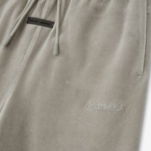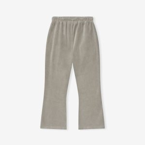 The Kids Flare Sweatpant is crafted from velvet velour for a plush. comfortable feel and cut in a relaxed silhouette that extends into a flared leg. Finishing details include an encased elastic waistband with elongated drawcords. side seam pockets. and a Fear of God Essentials rubberized label stitched at the center front.