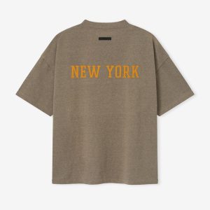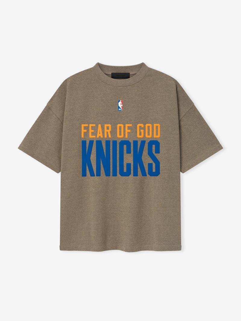 The Knicks 90s Tee is cut from 100% cotton jersey. offering a soft yet substantial hand feel. Designed in an oversized 90s-inspired silhouette. it features exaggerated proportions with dropped shoulders for a relaxed drape. The front is defined by a bold puffer-print application of the Fear of God Knicks lockup. alongside the authentic NBA insignia. The New York puffer print logo is across the back and the signature rubberized Fear of God Essentials label at the collar.
