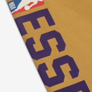 The NBA Lakers Sweatpant is crafted from 380gsm core fleece. offering both structure and body to its voluminous wide-leg silhouette. One leg features a bold ESSENTIALS print paired with the official NBA logo. while the Los Angeles Lakers team type accents the other. Finishing details include an encased elastic waistband with elongated drawcords. side seam pockets. and a Fear of God Essentials rubberized label stitched at the center front.