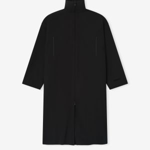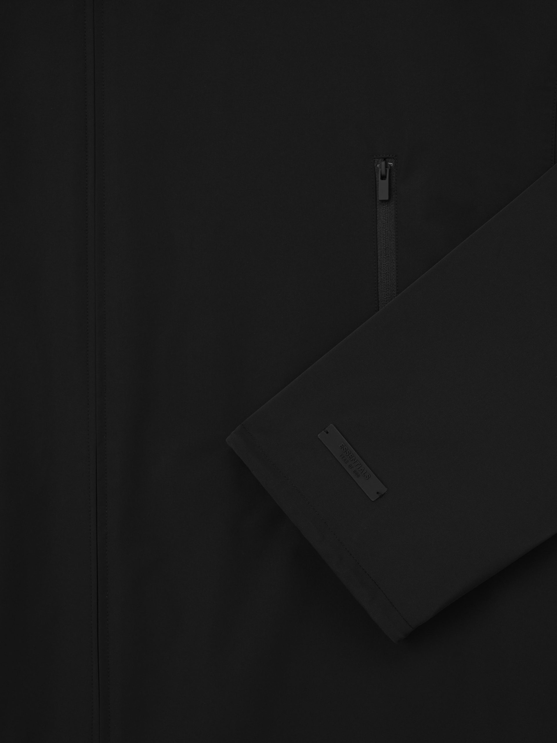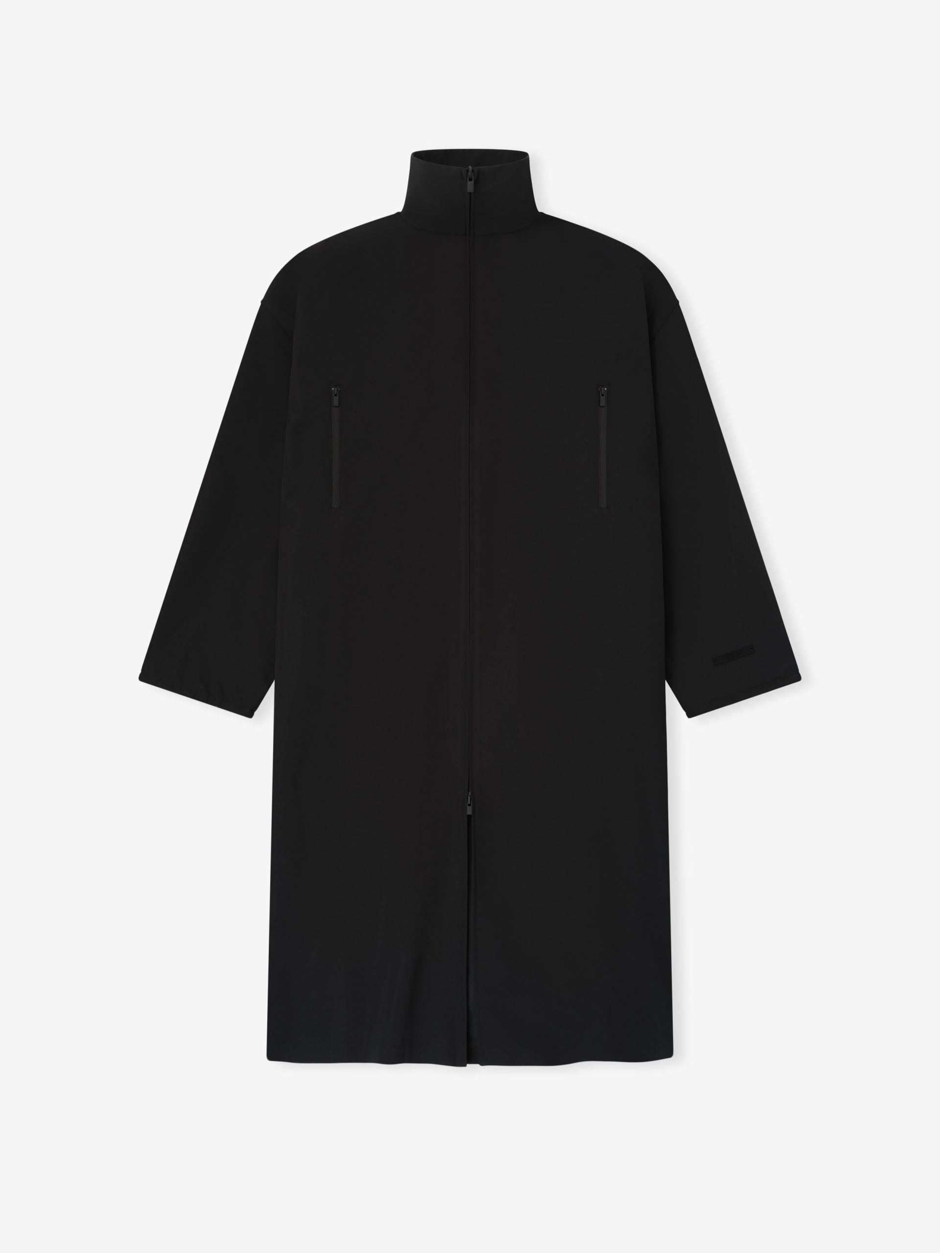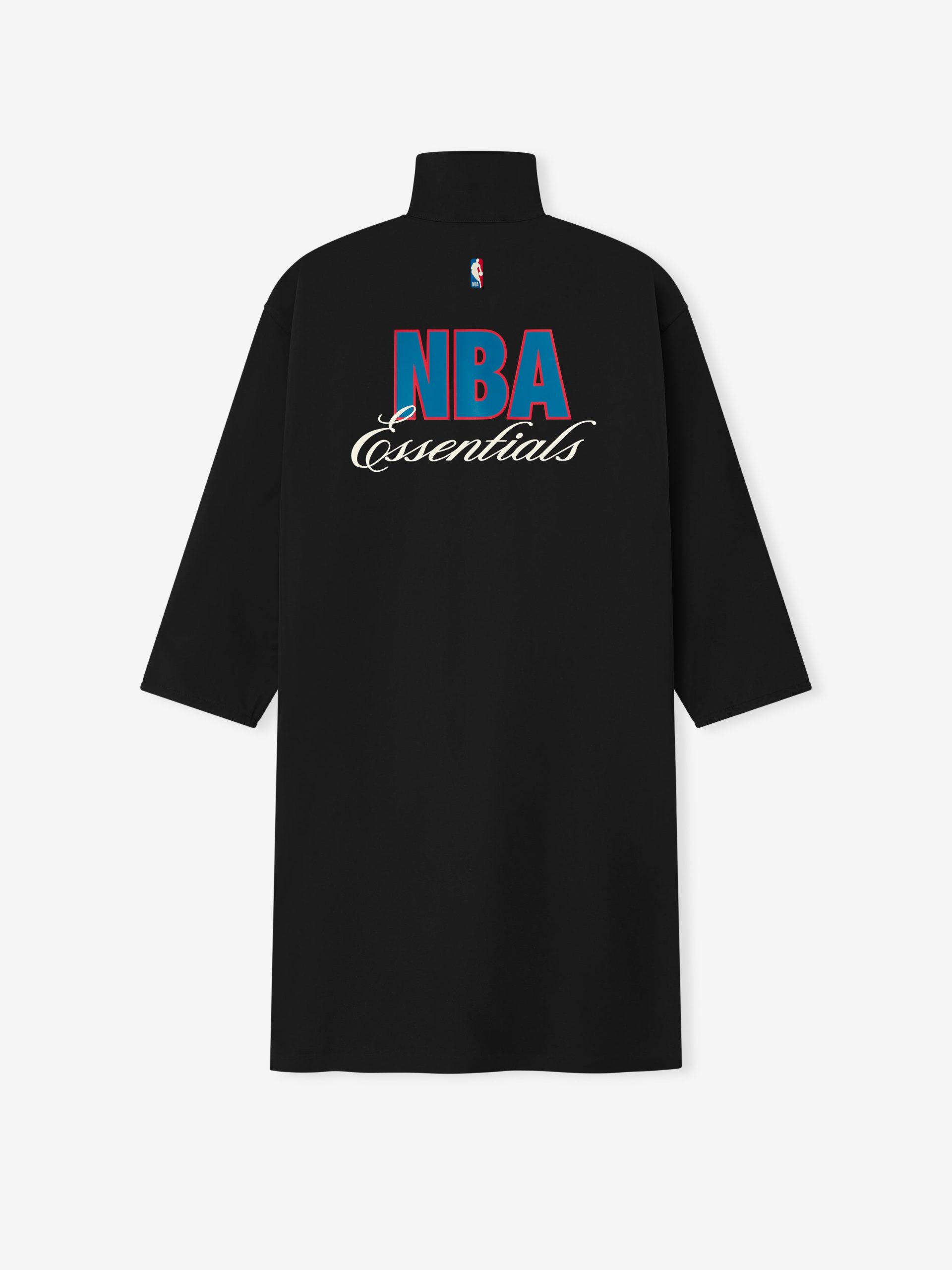 The NBA High Neck Car Coat is crafted from a stretch-woven fabric. offering stretch comfort and an oversized fit for movement. The back is detailed with an NBA ESSENTIALS lockup alongside the official NBA emblem. Functional elements include a full zip closure. and side seam pockets. A Fear of God ESSENTIALS rubberized label accents the sleeve.