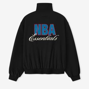 The NBA Half Zip Track Jacket is crafted from a sports fabric with full mesh lining. offering stretch comfort and an relaxed fit for movement. The front is detailed the official NBA emblem. while the back features a bold NBA ESSENTIALS lockup. Functional elements include a half-zip closure. side seam pockets. and elasticated collar. cuffs and waist hem. A Fear of God ESSENTIALS rubberized label accents the sleeve.