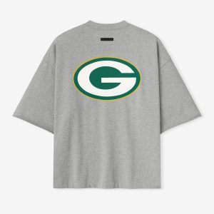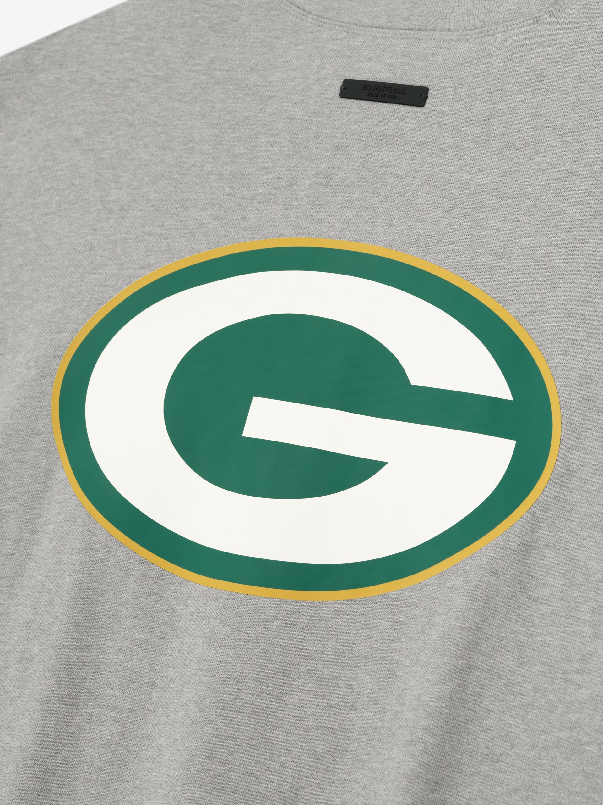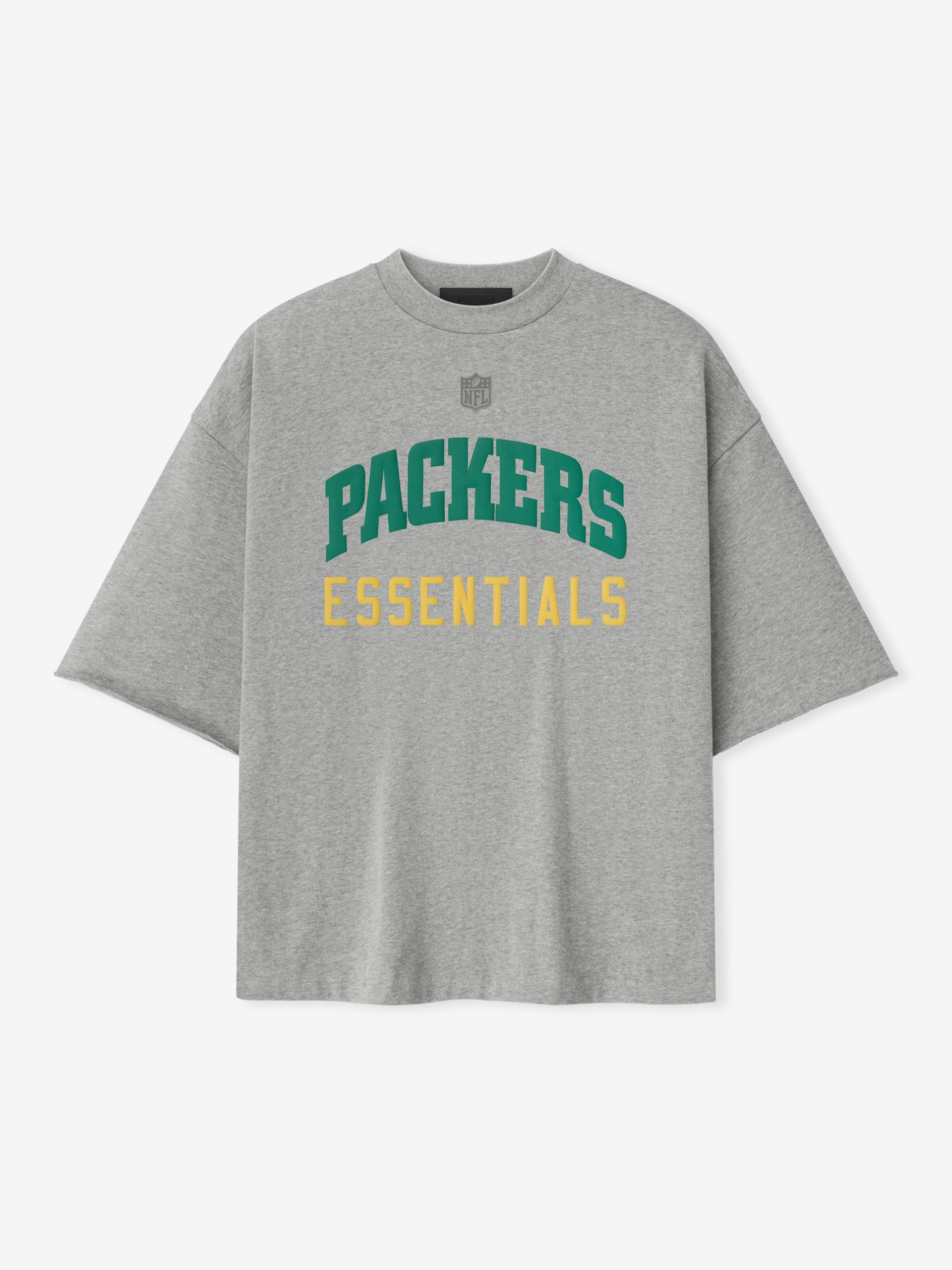 The Packers Sport 3/4 Sleeve Football Tee is crafted from heavy 100% cotton jersey and designed in an extra-oversized fit with proportions inspired by 90s throwback football jerseys. The front features a bold Packers Essentials puff-print graphic paired with the NFL shield. while the back displays the official Green Bay Packers logo. Additional details include rib-knit collar. and 3/4 sleeves with raw hemline. The look is finished with the signature rubberized Fear of God Essentials label.