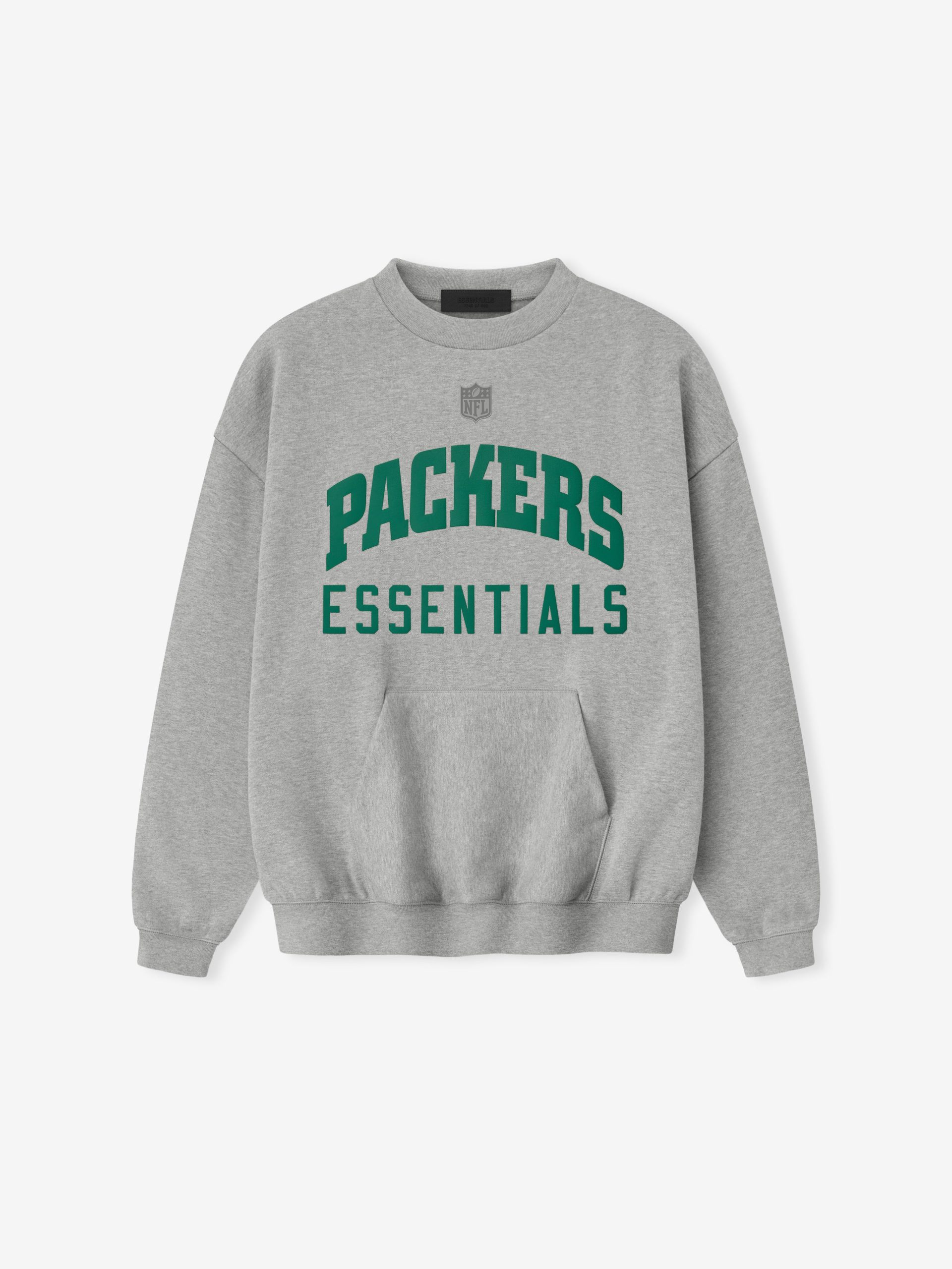 The Packers Sport Crewneck is crafted from heavy 480gsm core fleece and cut in a relaxed sport fit. The front features a bold Packers Essentials puff-print graphic. while the back displays the official Green Bay Packers logo. Additional details include a kangaroo pocket and rib-knit collar. cuffs. and waist hem. The look is finished with the signature rubberized Fear of God Essentials label.