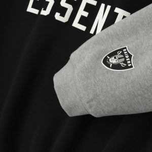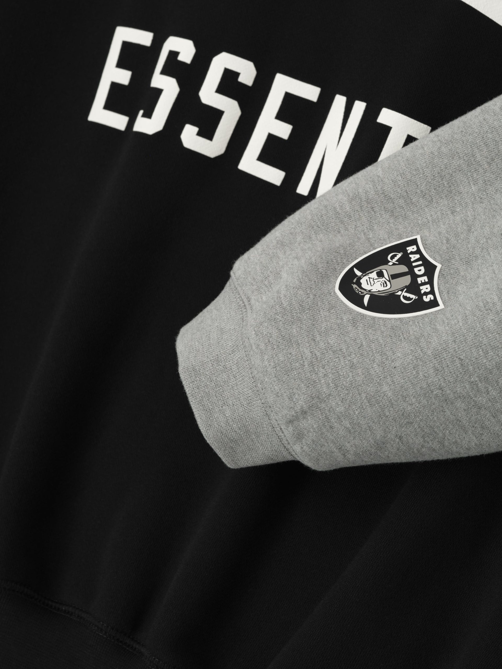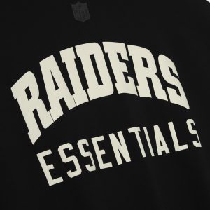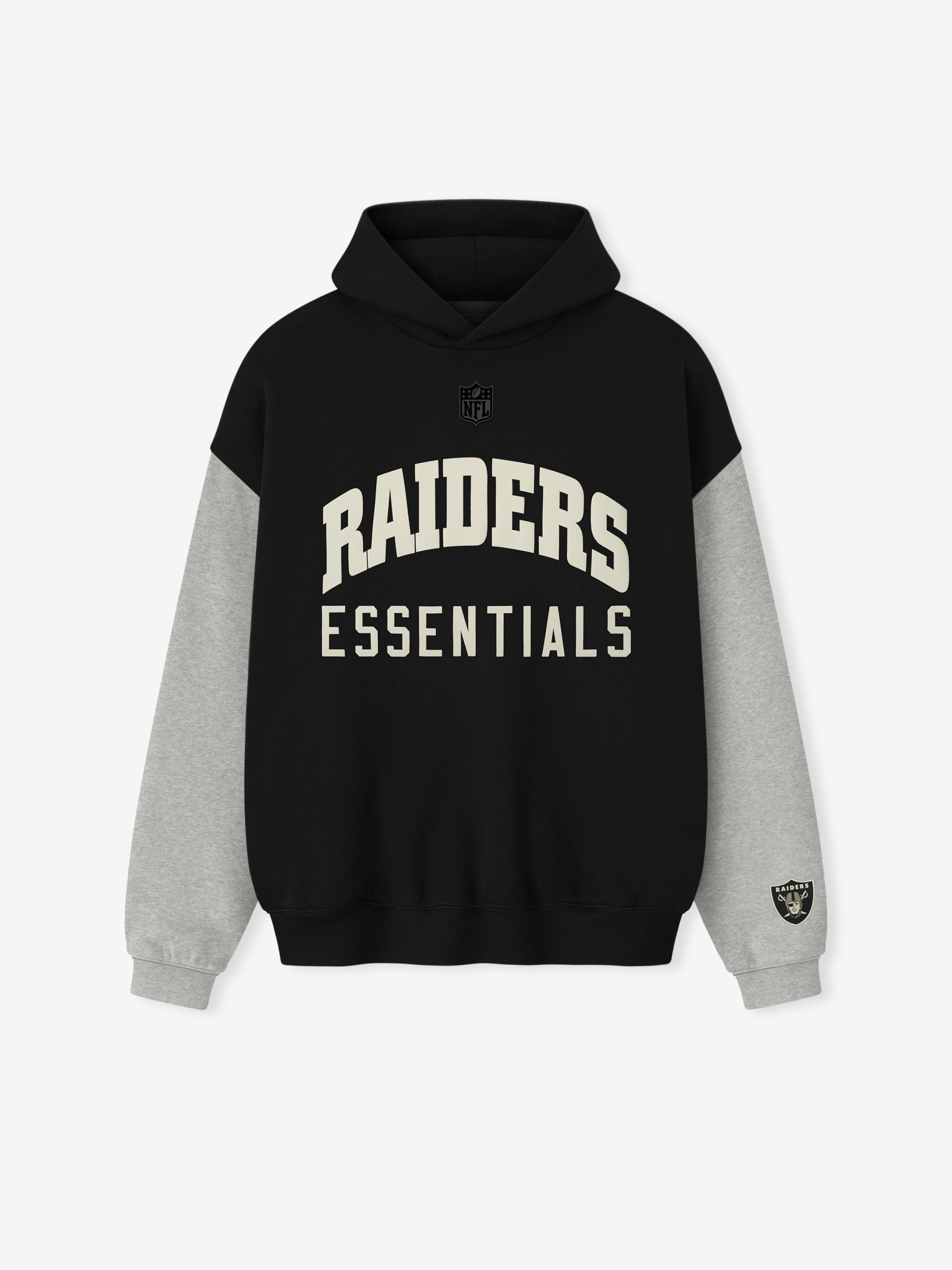 The Raiders Sport Hoodie is crafted from heavy 480gsm core fleece and cut in a relaxed sport fit. The front features a bold Raiders Essentials puff-print graphic paired with the official NFL shield logo. Additional features include. contrasting sleeves. side pockets. rib-knit at the cuffs and waist hem. The signature rubberized Fear of God Essentials label accents the hood.