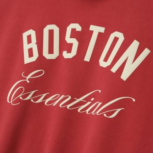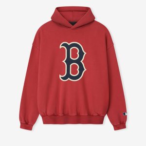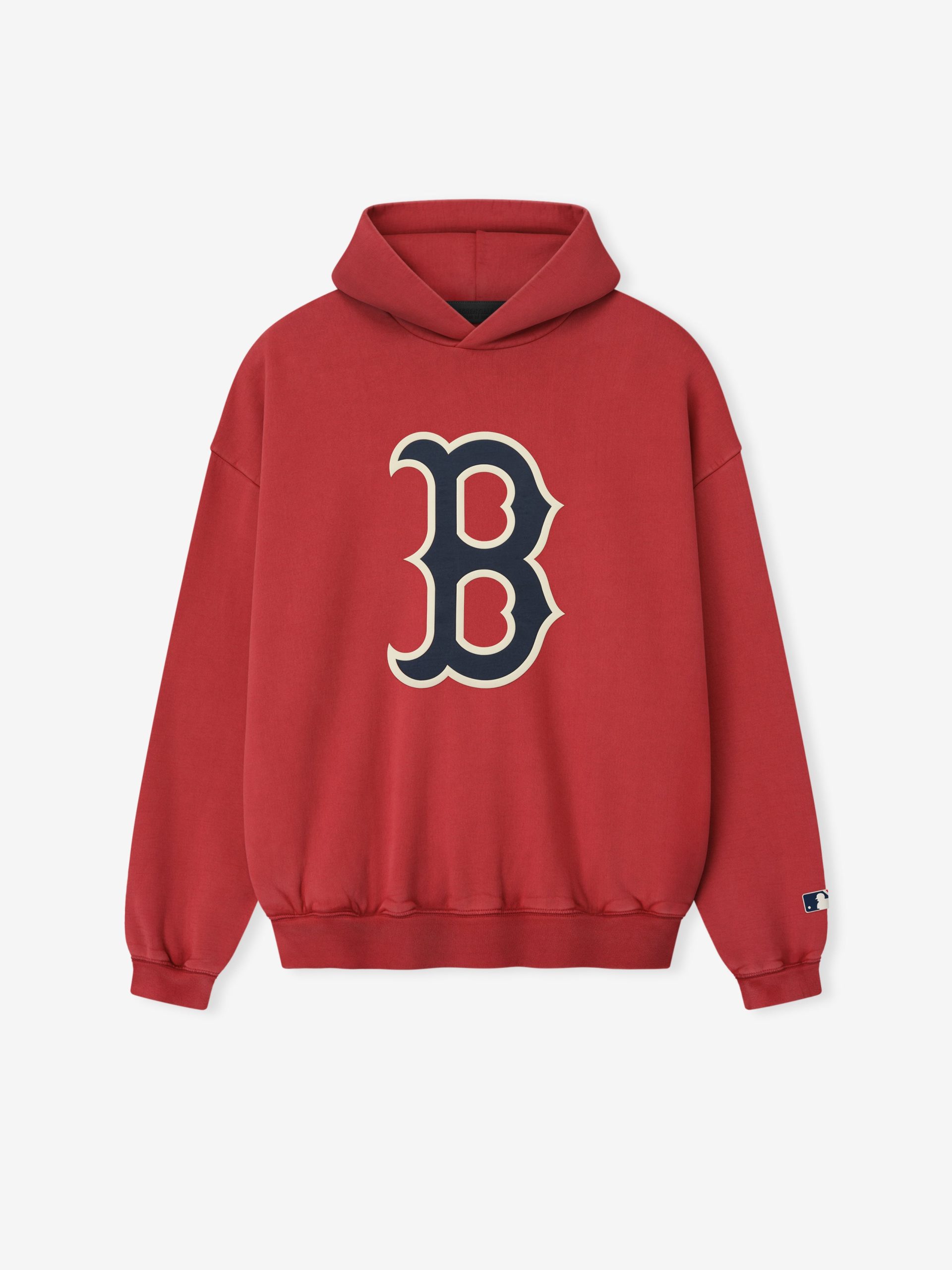 The Red Sox Sport Hoodie is crafted from pigment-dyed. heavyweight 520gsm cotton fleece. delivering a faded vintage feel and a sense of sports nostalgia. Designed in a relaxed Sport fit. the front features the iconic Boston Red Sox logo in a HD print. while the back showcases a Boston Essentials script lockup. Additional details include a MLB logo on the sleeve. side pockets. and rib-knit cuffs and waist hem. The look is finished with the signature rubberized Fear of God Essentials label at the hood.