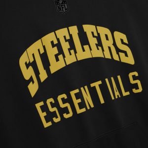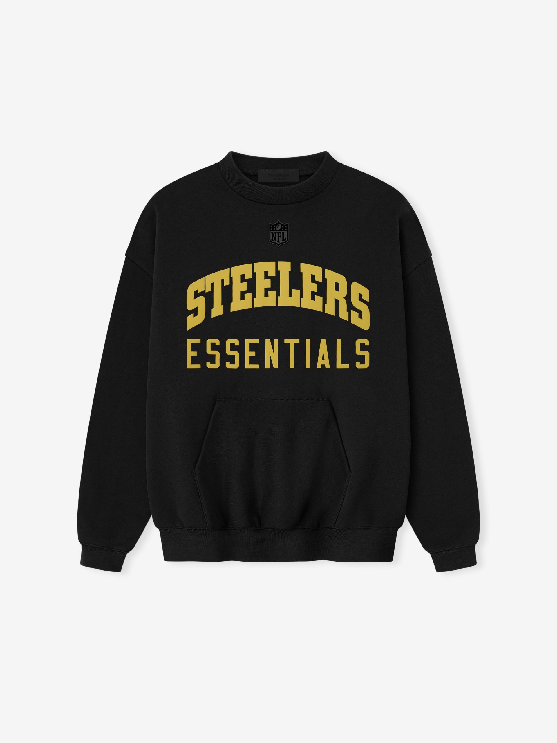The Steelers Sport Crewneck is crafted from heavy 480gsm core fleece and cut in a relaxed sport fit. The front features a bold Steelers Essentials puff-print graphic. while the back displays the official Pittsburg Steelers logo. Additional details include a kangaroo pocket and rib-knit collar. cuffs. and waist hem. The look is finished with the signature rubberized Fear of God Essentials label.