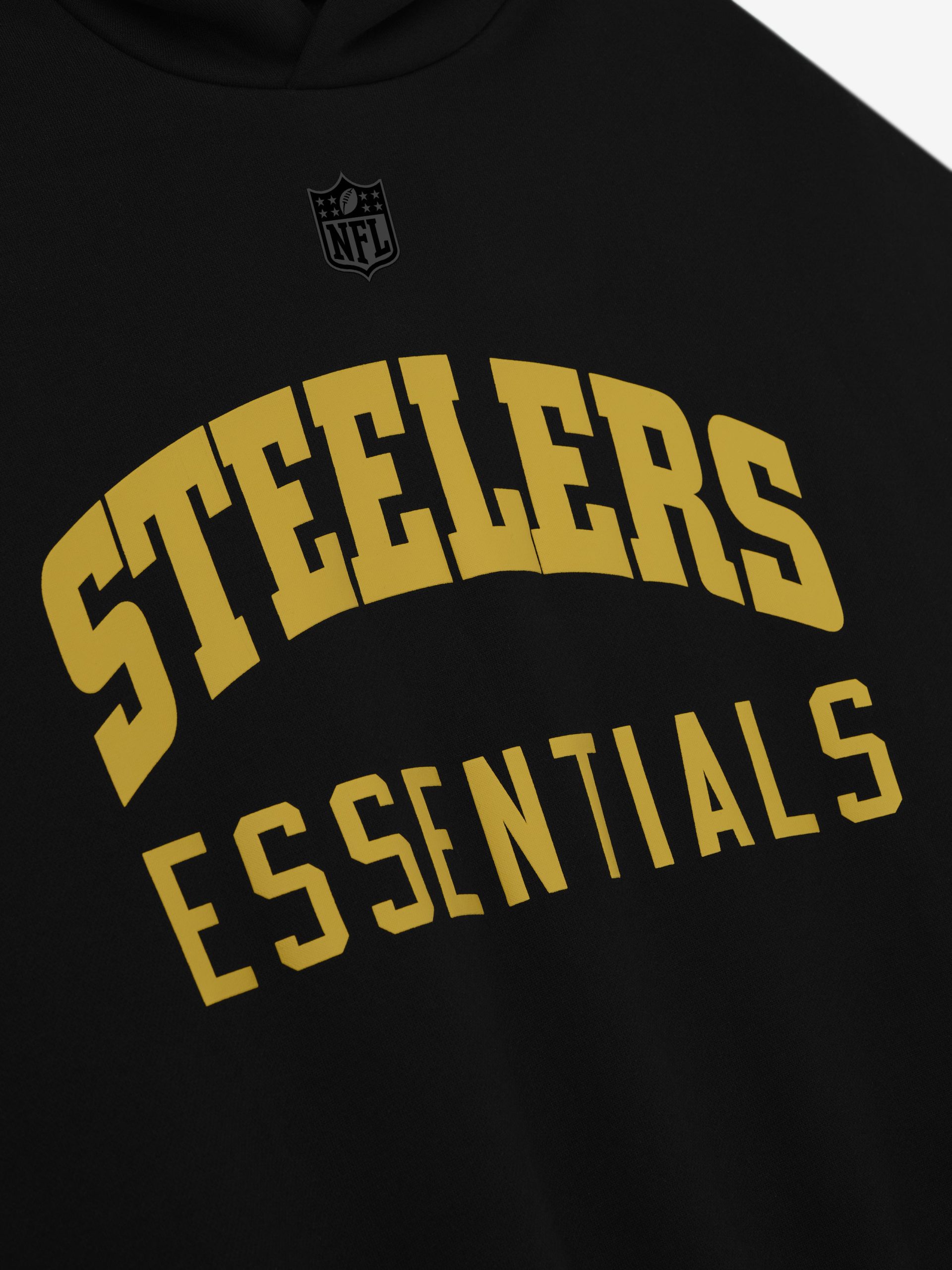 The Steelers Sport Hoodie is crafted from heavy 480gsm core fleece and cut in a relaxed sport fit. The front features a bold Steelers Essentials puff-print graphic paired with the official NFL shield logo. Additional features include. contrasting sleeves. side pockets. rib-knit at the cuffs and waist hem. The signature rubberized Fear of God Essentials label accents the hood.