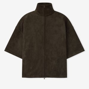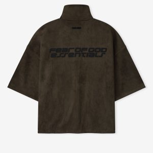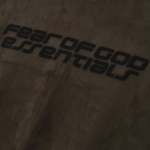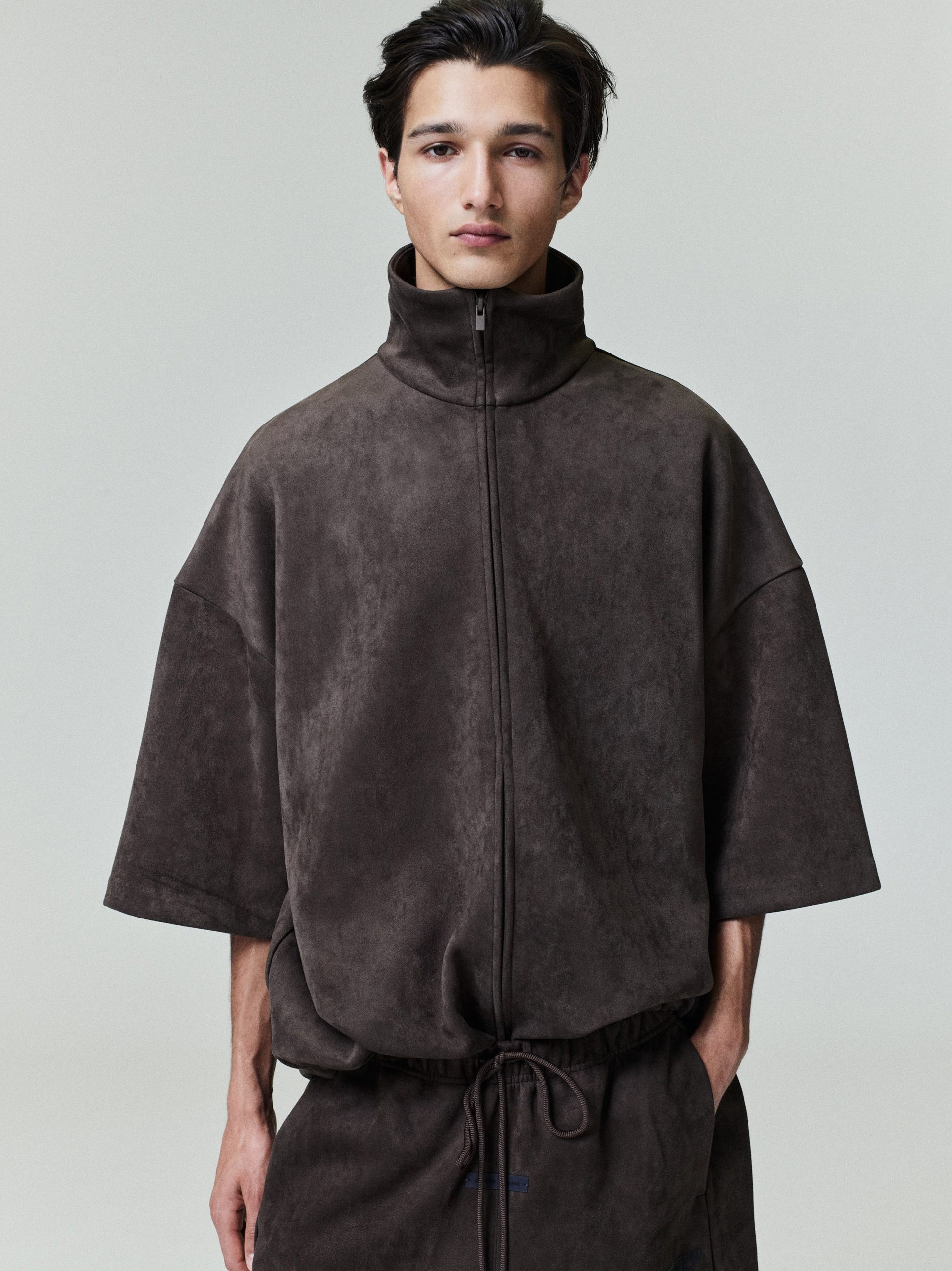 The 3/4 Sleeve Jacket is crafted from bonded suede fleece. offering a plush. suede-like hand feel that complements the modern fit with a wider oversized silhouette. The piece is detailed with a HD-printed Fear of God Essentials lockup on the back while finishing touches include a high neck. full zip front. and waist hem bungee toggle for adjustability. A Fear of God Essentials rubberized label stitched at the back.