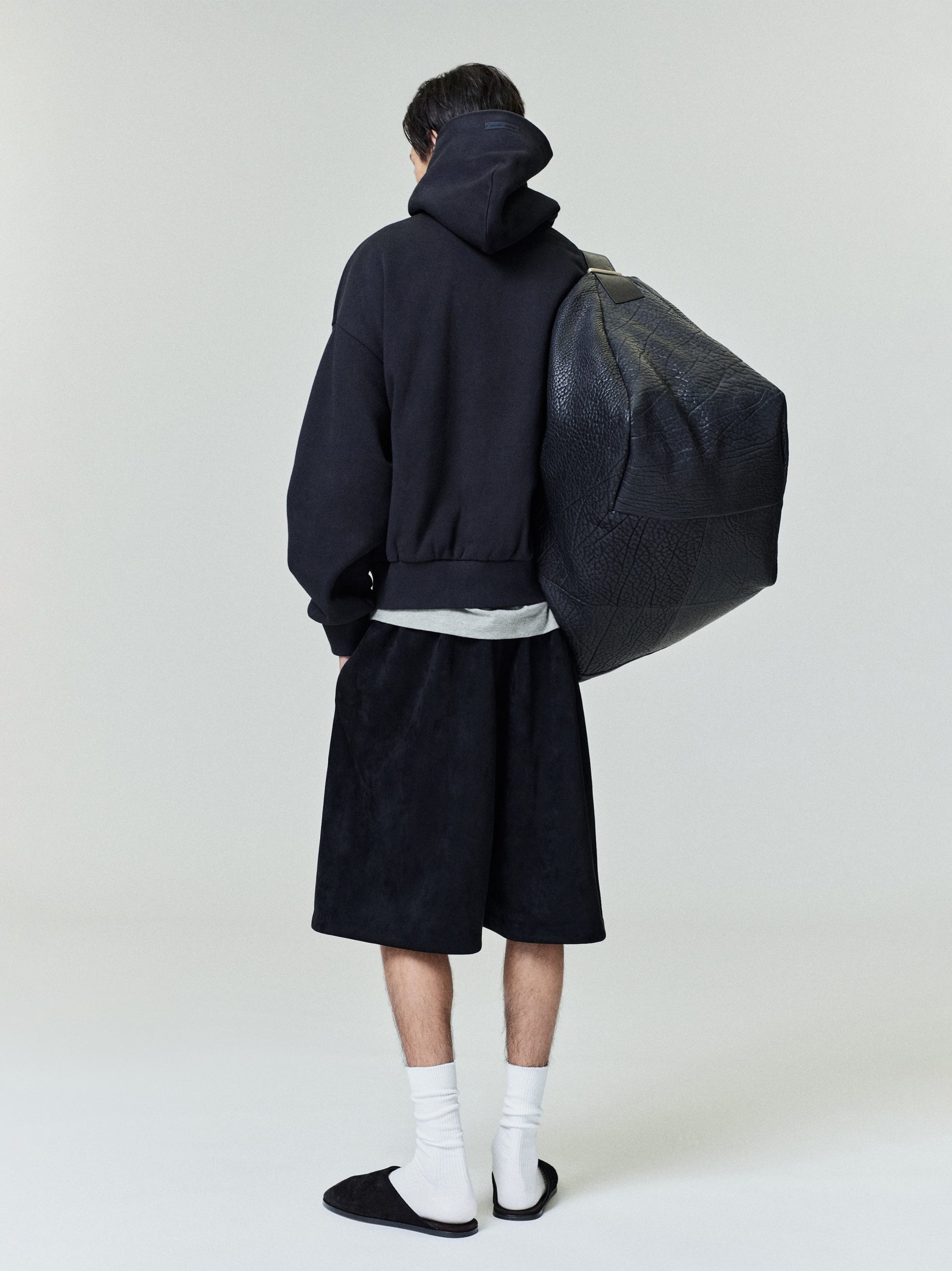 The Relaxed Sweatshort is crafted from bonded suede fleece. offering a plush. suede-like hand feel. Its voluminous wide-leg silhouette is defined by front seams. and a bold Fear of God Essentials HD print graphic. Finishing details include encased elastic waistband with elongated drawcords. side seam pockets. and a Fear of God Essentials rubberized label stitched at the center front.