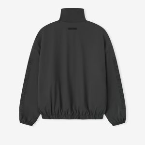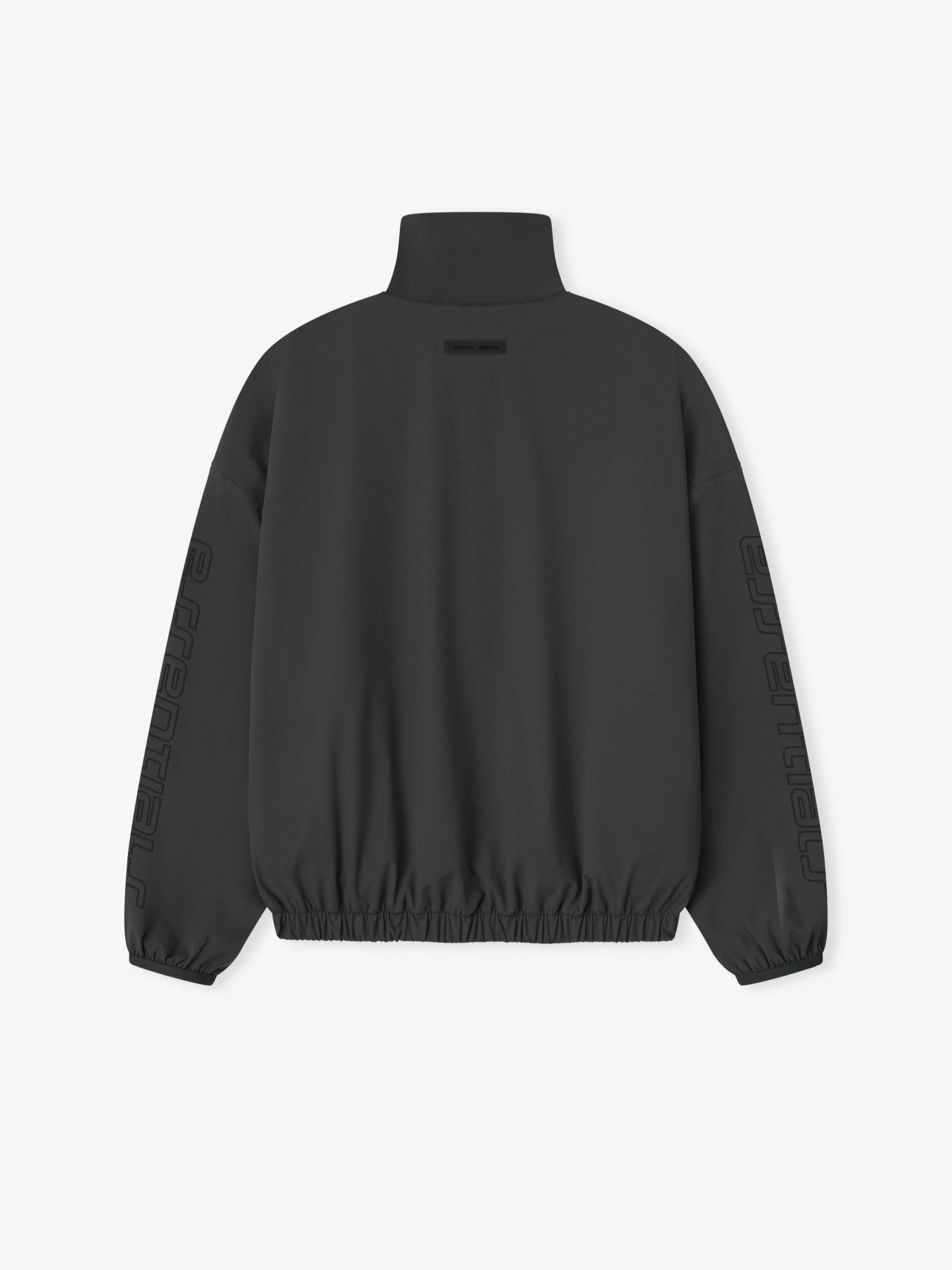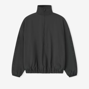 The Half Zip Track Jacket is crafted from tech nylon-spandex offering both stretch comfort and water repellant functionality. The piece is detailed with an metallic 3M-printed Essentials graphic on the sleeves to enhance its relaxed. rounded silhouette. Additional details include a high neck. half-zip front. elasticized cuffs and waist hem. A Fear of God Essentials rubberized label stitched at the center front.