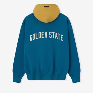 The Warriors Sport Hoodie is crafted from core fleece. offering an elevated balance of softness. structure. and lasting comfort. Cut in a relaxed sport fit. it drapes with more ease through the body and extended length compared to the Essentials classic silhouette. The front features a bold puff-print graphic Warriors Essentials alongside the authentic NBA logo. while the back showcases the Golden State logo. Additional features include contrasting hood. side pockets. rib-knit at the cuffs and waist hem. The signature rubberized Fear of God Essentials label accents the hood.