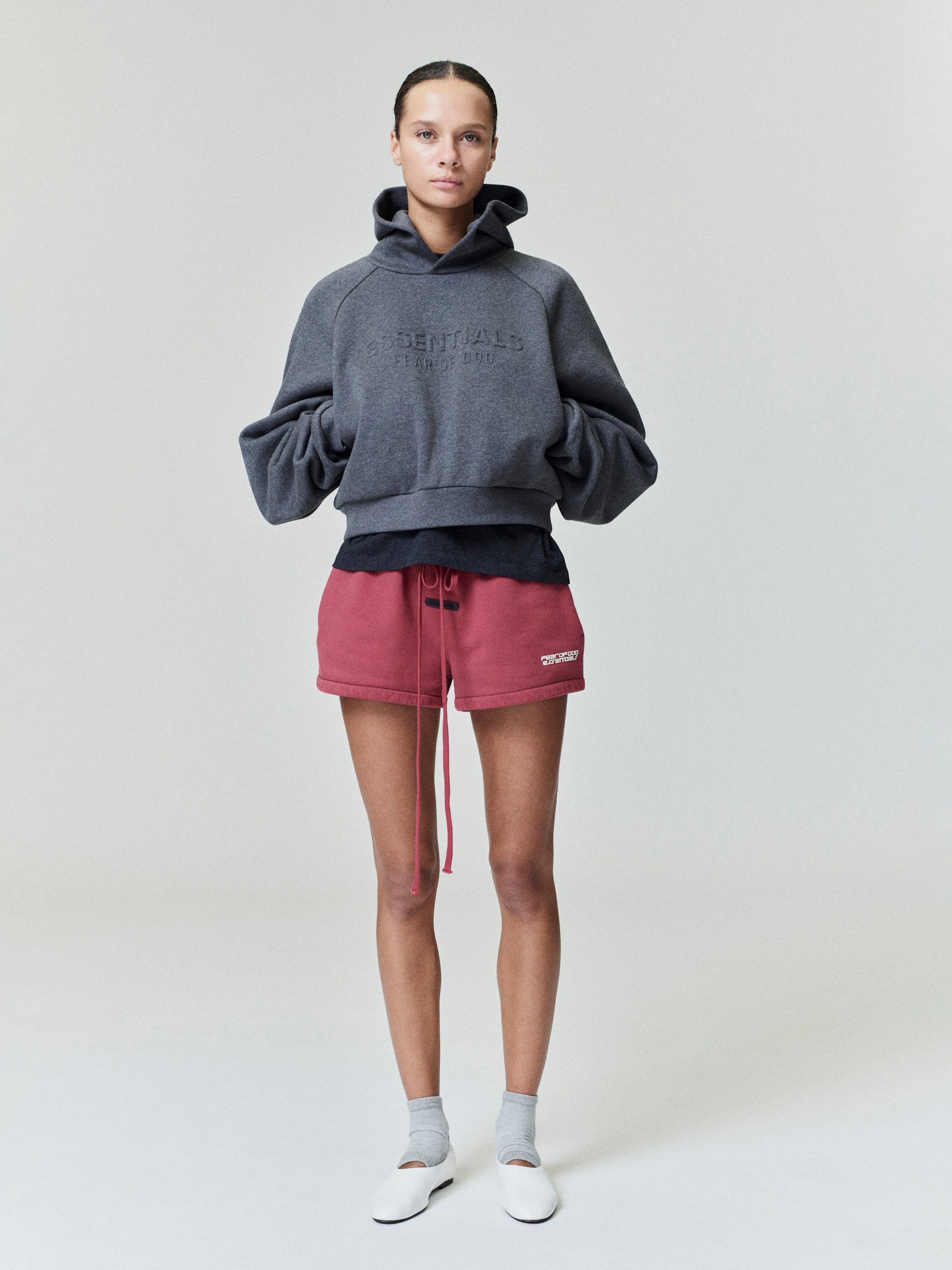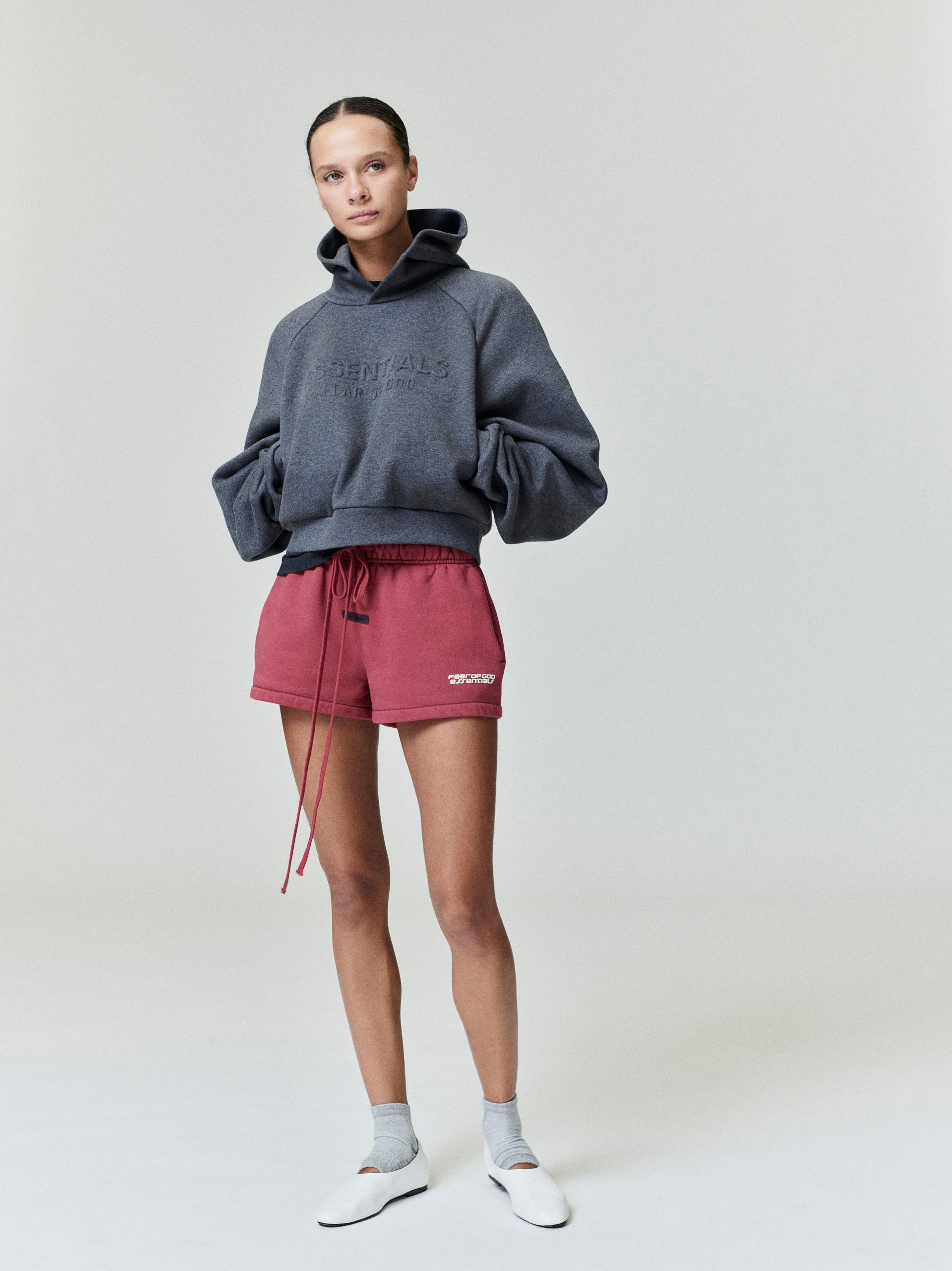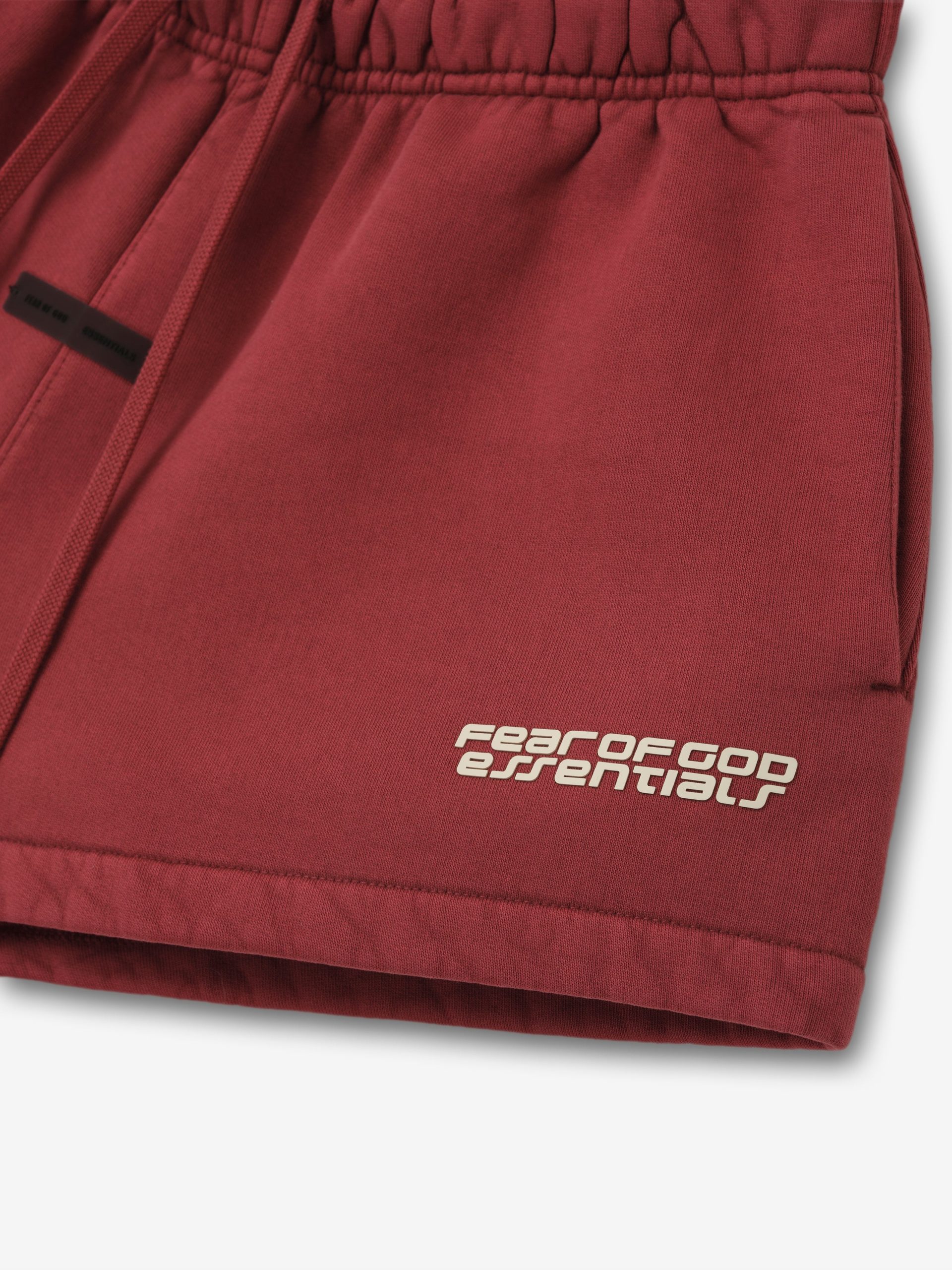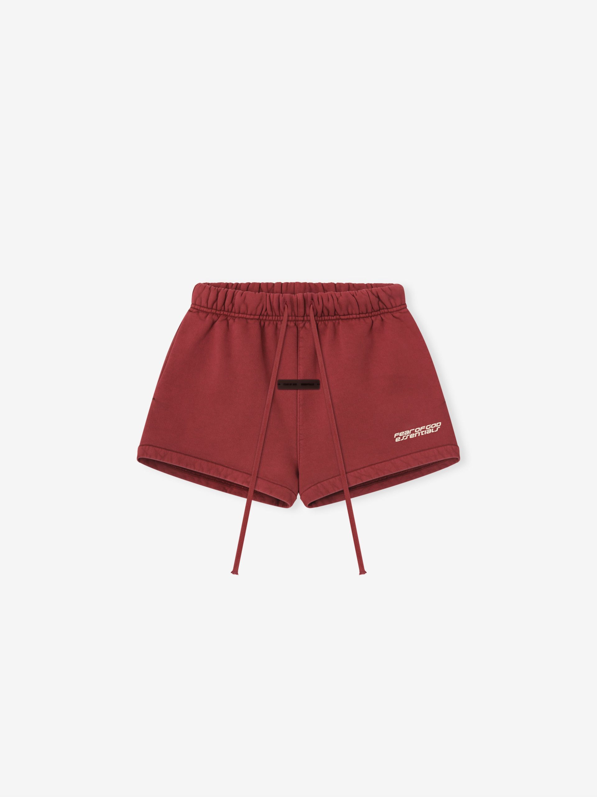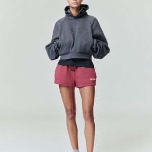 The Women’s Relaxed Sweatshort is crafted from 520gsm heavy fleece and treated with a pigment dye to create rich depth of color. Its voluminous wide-leg silhouette is defined by a racing inspired Fear of God Essentials HD print graphic. Finishing details include encased elastic waistband with elongated drawcords. side seam pockets. and a Fear of God Essentials label stitched at the center front.